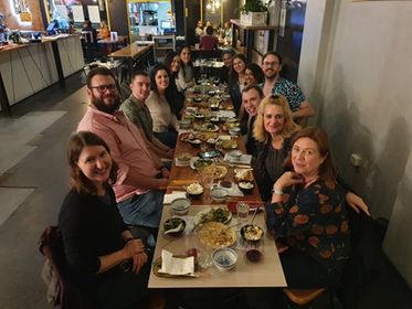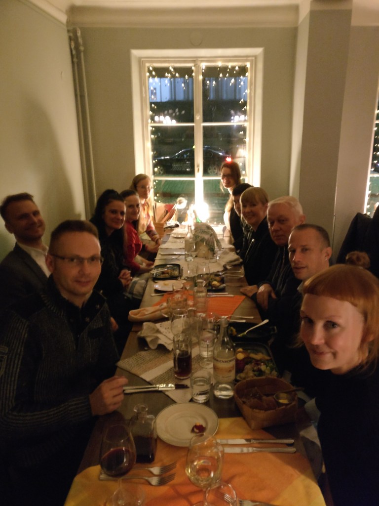Dr Kyra Hamilton enjoying a traditional Finnish dinner with keynote presenter Professor Gerjo Kok and delegates at the 2017 National Health Psychology Conference in Helsinki, Finland.