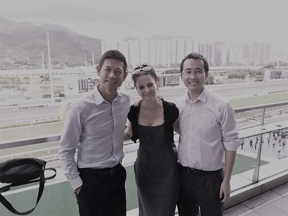 Dr Kyra Hamilton visiting the horse races in Hong Kong with Hong Kong Baptist University hosts Professor Pak-Kwong Chung and Dr Chunqing Zhang in June 2017