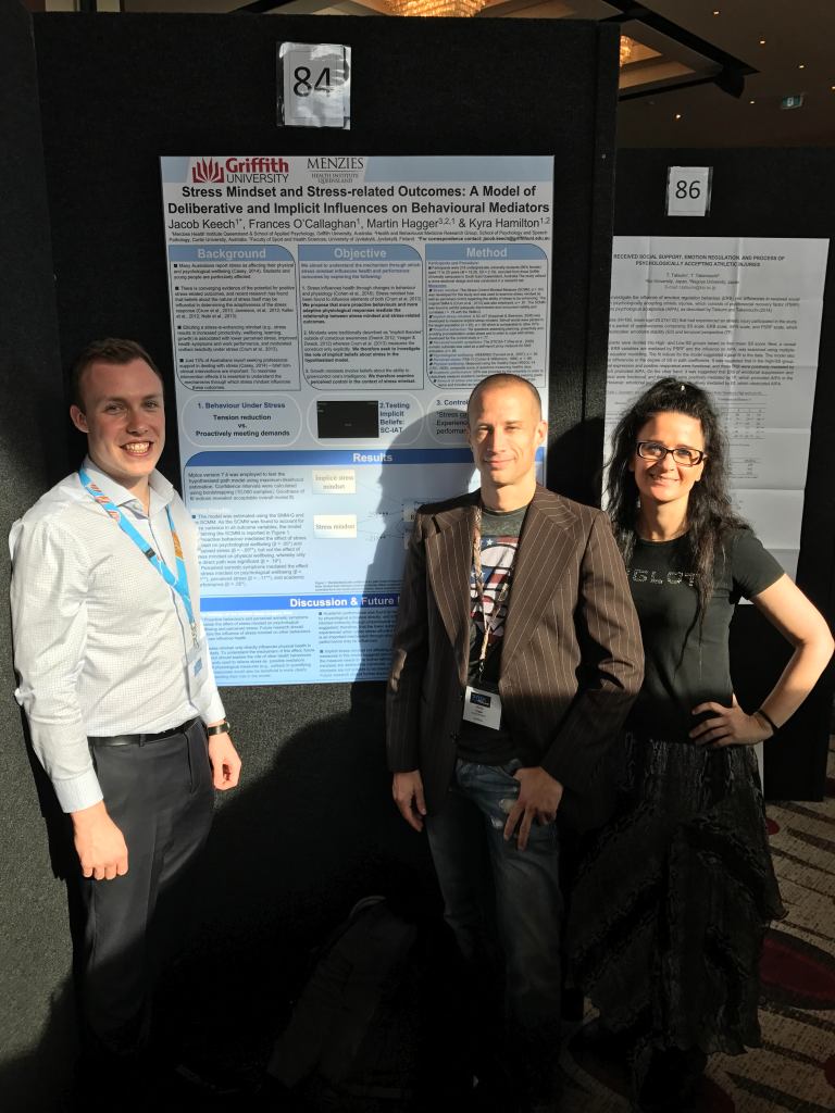 HaPI researchers Jacob Keech, Professor Martin Hagger, and Dr Kyra Hamilton presenting research investigating how beliefs about the nature of stress (stress mindset) influence health and performance outcomes at the 2016 International Congress of Behavioral Medicine in Melbourne, Australia.
